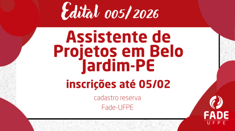 A Fade-UFPE torna público o seu edital de número 005/2026 para o cadastro de reserva de Assistente de Projetos em Belo Jardim-PE, com inscrições até o dia 05 de fevereiro.