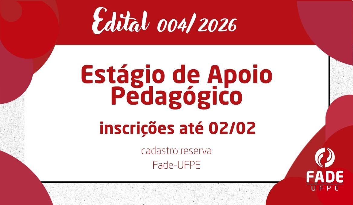 A Fade-UFPE torna público o seu edital de número 004/2026, para o cadastro de reserva de estágio de apoio pedagógico, com inscrições até 02 de fevereiro.