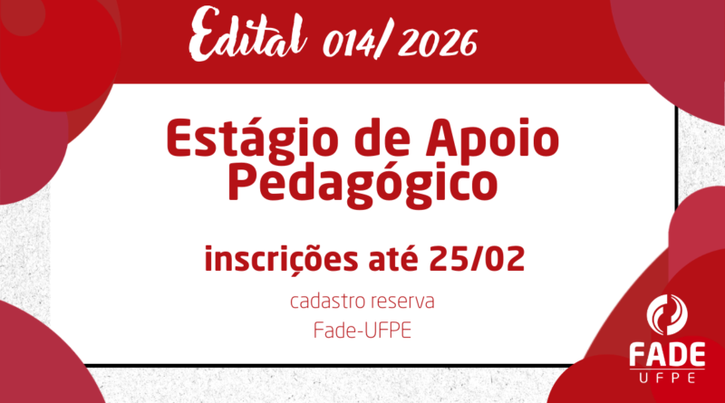 A Fade-UFPE torna público o seu edital de número 014/2026, para o cadastro de reserva de estágio de Apoio Pedagógico, com inscrições até o dia 25 de fevereiro.
