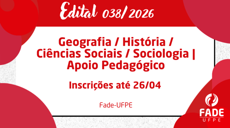 A Fade-UFPE torna público o seu edital de número 038/2026, para preenchimento de vaga de Apoio Pedagógico como Professor Autor Maker 1 (Geografia / História / Ciências Sociais / Sociologia), com inscrições até o dia 26 de abril.